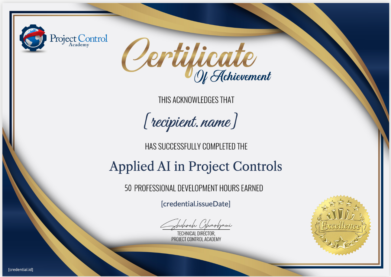 This is the first live delivery of the Applied AI in Project Controls course before it transitions into a self-paced online program. The live training gives you the exclusive opportunity to interact directly with the instructors, ask questions in real time, and gain deeper insights into the lessons and demonstrations.